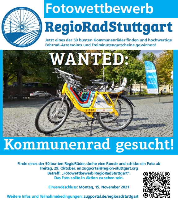Finde eines der 50 bunten Kommunenräder von RegioRadStuttgart, drehe eine Runde und schicke ab 29. Oktober ein kreatives Foto in Aktion an zugportal@region-stuttgart.org – Betreff „Fotowettbewerb RegioRadStuttgart“. Gewinne hochwertige Fahrradaccessoires und Freiminuten-Gutscheine für RegioRadStuttgart!