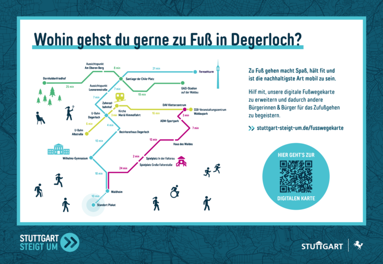 Parallel hängen in den Stuttgarter Bezirken Degerloch, Hedelfingen, Mühlhausen, Münster, Plieningen, Sillenbuch, Stammheim, Untertürkheim, Vaihingen und Weilimdorf Großflächenplakate aus, die zeigen, welche Alltagswege im jeweiligen Bezirk bequem zu Fuß zurückgelegt werden können.