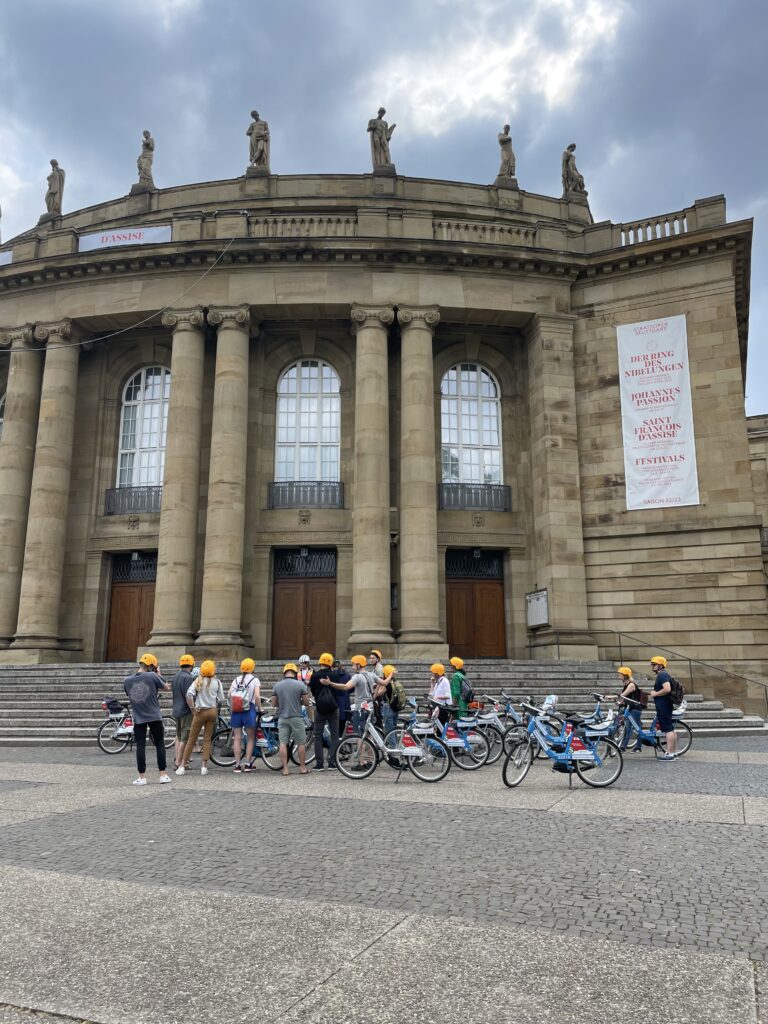 Auf den RegioPedelecs ging es quer durch die Stuttgart Innenstadt. 15 Teilnehmende, die zum ersten Mal auf dem Rad in Stuttgart unterwegs waren, erhielten Einblicke in die örtliche Radverkehrsinfrastruktur und aktuelle Mobilitäts- und Stadtentwicklungsprojekte. Auch das Sightseeing kam nicht zu kurz. Die Tour startete am Stuttgarter Rathaus und führte durch den Schlossgarten bis zu den Mineralquellen am Leuze und zurück bis zur Tübinger Straße – mit Zwischenstopps am Landtag, Stuttgarter Opernhaus, Hauptbahnhof, Rosensteintunnel und der Fahrradstraße Eberhardstraße.